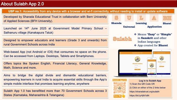 Launched on 15th June 2024, Sulabh App (Sharada Universal Learning App for Bharat) is a transformative EdTech platform pioneered by Sharada Educational Trust in collaboration with Bern University of Applied Sciences (BFH University). Designed to empower learners and educators in rural and underserved communities, the Web-based App offers accessible, self-paced courses in Spoken English, Financial Literacy, General Knowledge, Soft Skills, and more.